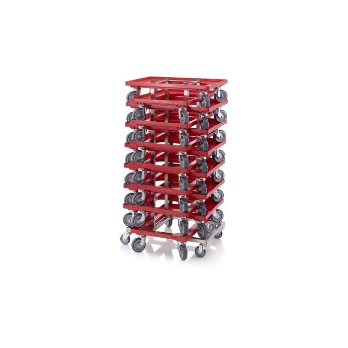 Dollie stacker on wheels made of stainless steel stainless steel DIN 1.4301 from NORAH Plastics. Efficient, collecting or for grouping several dollies at the same time. The stacker prevents dollies lying around and accommodates up to 15 dollies when stacked to save space. Four smooth-running casters with rubber tread and brake allow the stacker to be moved particularly smoothly and easily.