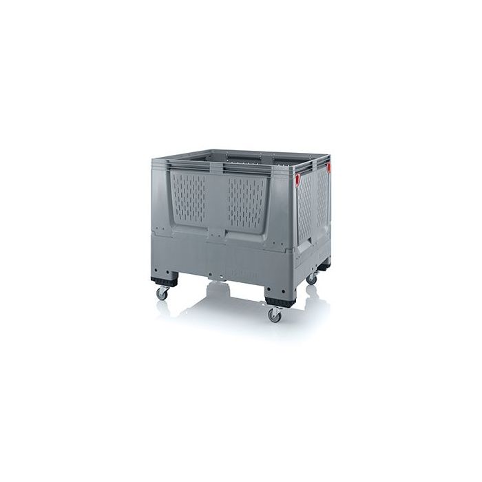 Folding Bulk pallet box on wheels with 4 folding perforated walls for optimum refrigerated circulation and space saving in storage and return transport of empty pallet boxes in the folded state. NORAH Plastics' folding pallet boxes create a significant storage, back-and-forth transportation advantage due to their reduced volume when folded shut. All four folding walls fold quickly and easily. The folding pallet boxes are perfectly stackable both in folded and unfolded condition and offer great stacking stability. Easy to clean due to smooth walls on the inside. In movable on 4 sides with hand pallet truck or forklift truck. A no-nonsense design, extremely strong also on the hinges. Known for their large volume and economic storage capacity. Plastic pallet box or Big Box is a durable hygienic container that is indispensable within a company.