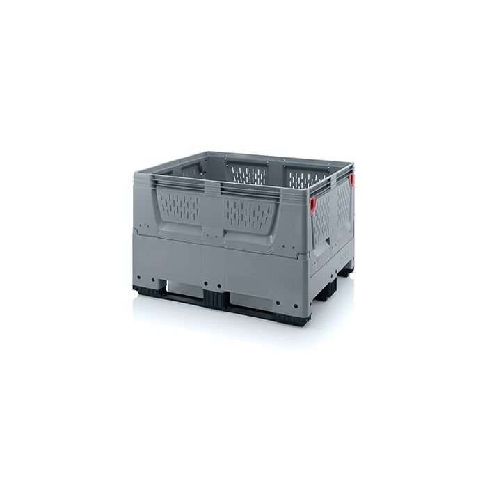 Foldable Bulk pallet box with 4 folding perforated walls and bottom on 3 skids for optimal refrigerated circulation and space saving in storage and return transport of empty pallet boxes in folded state. NORAH Plastics' folding pallet boxes create a significant storage, back-and-forth transportation advantage due to their reduced volume when folded shut. All four folding walls fold quickly and easily. The folding pallet boxes are perfectly stackable both in folded and unfolded condition and offer great stacking stability. Easy to clean due to smooth walls on the inside. In movable on 4 sides with hand pallet truck or forklift truck. A no-nonsense design, extremely strong also on the hinges. Known for their large volume and economic storage capacity.