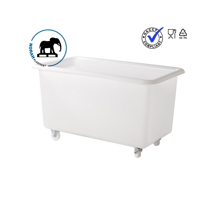 Food Grade transport Cart, 450 liters from NORAH Plastics, a hygienic and user-friendly design. The best choice when it comes to processing, preparation, production, storage or transport of food and pharmaceuticals. The walls and the bottom are completely closed and particularly smooth, without external rib structures; this makes the transport trolleys quick, thorough cleaning or disinfection, freezer resistant, odorless, tasteless and suitable for food contact. Through the use of high-quality HDPE, the carts are particularly impact-resistant and shock-proof. The trolleys are particularly easy to clean and are mainly used when good hygiene is important. Individual printing such as name and logo is possible on request. Our Food Line transport trucks comply with today's quality systems such as - HACCP, BRC and NSF regulations.