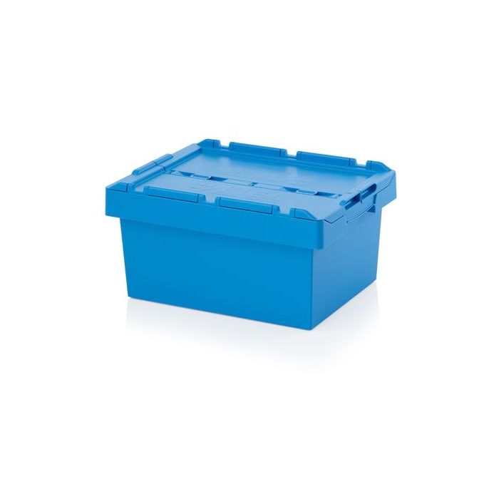Deployable within the distribution sector; on the one hand due to optimum inner volume of these transport bins, and on the other due to space saving in storage and transport of empty bins in nested condition. The distribution bins with robust hinged lid halves can be stacked stably on top of each other when closed. They close into each other and ensure perfect closure of the bin. They also offer the possibility of sealing the distribution bin by means of sealing plugs. The deepening in the lid area keeps the stack stable. The smooth inner walls are designed almost vertically and prevent damage to products. With lids open, distribution bins can be nested together to save up to 75% during transport and storage of empty bins.