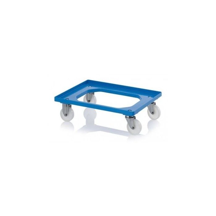 Transport dolly with smooth white wheels, ideal for flat production floors, made of robust and impact-resistant plastic. With our mobile pedestals you can easily move storage and transport bins from A to B. The format is tailored to all Euro format stacking bins: 400x300mm, 600x400mm and 800x600mm. A well thought-out design with smooth finished raised edges all around and internal rounded corners so that there is no risk of cutting products, while carrying or picking them up. The trolleys function perfectly in hygienic environments production departments and workshops, where the crates should not come into contact with the work floor.