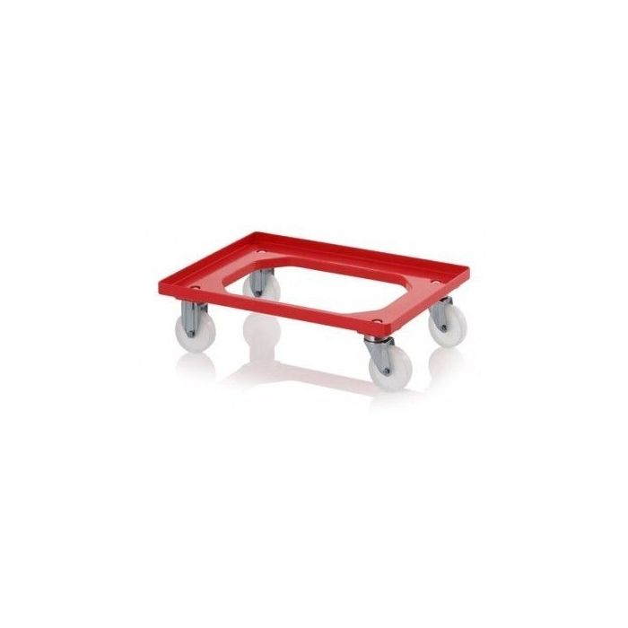 Transport dolly with smooth white wheels, ideal for flat production floors, made of robust and impact-resistant plastic. With our mobile pedestals you can easily move storage and transport bins from A to B. The format is tailored to all Euro format stacking bins: 400x300mm, 600x400mm and 800x600mm. A well thought-out design with smooth finished raised edges all around and internal rounded corners so that there is no risk of cutting products, while carrying or picking them up. The trolleys function perfectly in hygienic environments production departments and workshops, where the crates should not come into contact with the work floor.