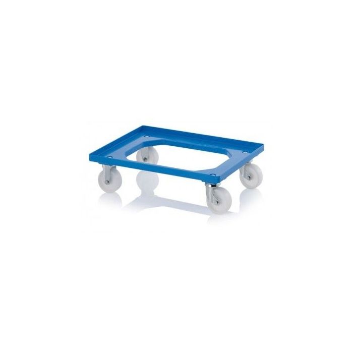 Transport dolly with smooth white wheels, ideal for flat production floors, made of robust and impact-resistant plastic. With our mobile pedestals you can easily move storage and transport bins from A to B. The format is tailored to all Euro format stacking bins: 400x300mm, 600x400mm and 800x600mm. A well thought-out design with smooth finished raised edges all around and internal rounded corners so that there is no risk of cutting products, while carrying or picking them up. The trolleys function perfectly in hygienic environments production departments and workshops, where the crates should not come into contact with the work floor.