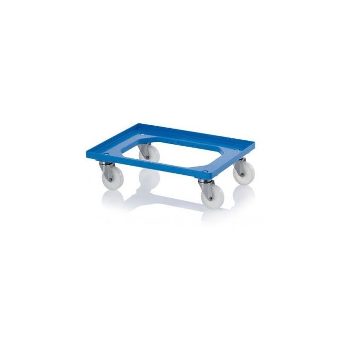 Transport dolly with smooth white wheels, ideal for flat production floors, made of robust and impact-resistant plastic. With our mobile pedestals you can easily move storage and transport bins from A to B. The format is tailored to all Euro format stacking bins: 400x300mm, 600x400mm and 800x600mm. A well thought-out design with smooth finished raised edges all around and internal rounded corners so that there is no risk of cutting products, while carrying or picking them up. The trolleys function perfectly in hygienic environments production departments and workshops, where the crates should not come into contact with the work floor.