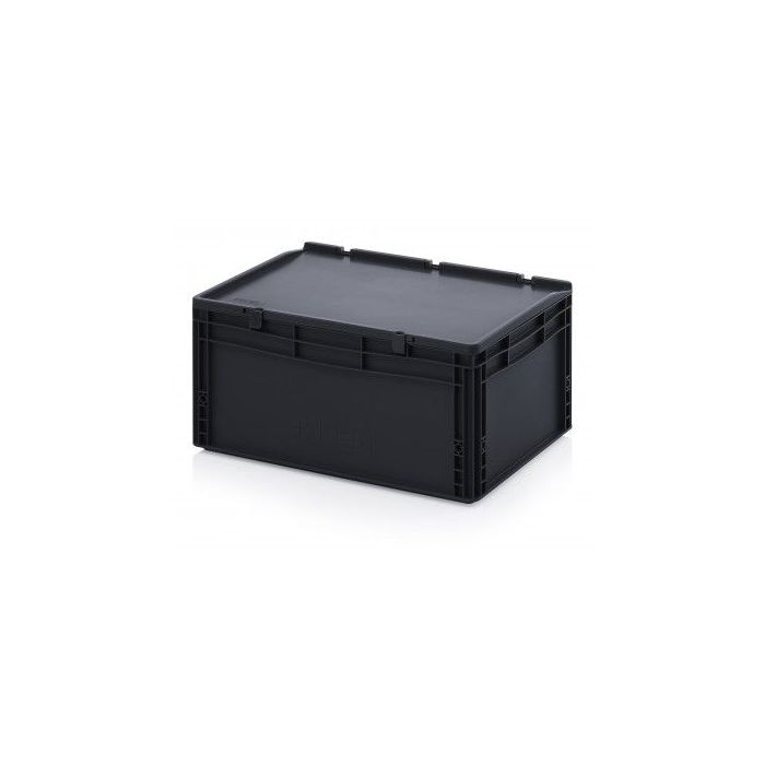 - Euro-ESD stacking bin with hinged lid, ideal for transport and storage of electronically sensitive products