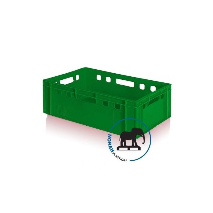 Production container for the hygienic transport, weighing and storage of various meat products. The crates are produced according to DIN 55423 standard and thus meet the strict requirements of the EHI. The meat crates E1, E2 and E3 as well as the poultry crates E4 and E5 are used in the European meat and poultry industry as pool crates in a so-called open-pool system. In this system, each user, manufacturer or wholesaler buys his crates according to his own requirements. The crates circulate between the various users and are exchanged on delivery. The crates are physiologically comfortable and 100% recyclable, therefore good for the environment. Extremely stable stacking and compatible with other Euro-format stacking bins, pallets, roll containers and transport dollies. Individual printing such as name and logo possible on request - Suitable for processing industry, trade, retail, commercial sectors and catering.